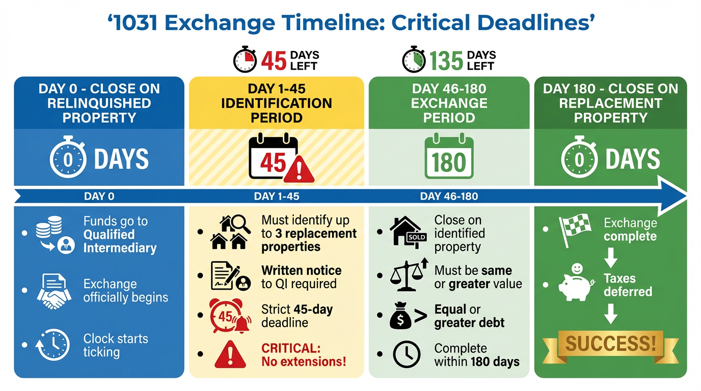 The IRS has strict deadlines for 1031 exchanges. Miss them and you lose the tax deferral.