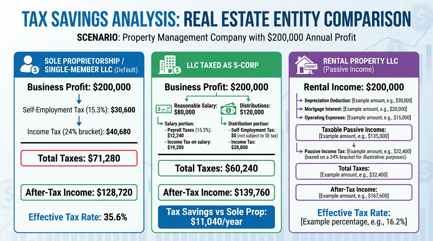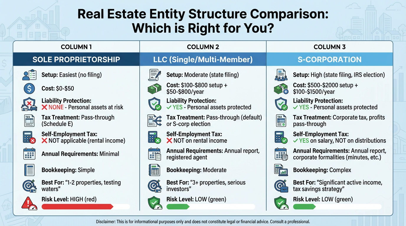 LLC vs S-Corp vs Sole Proprietorship for Real Estate: Complete 2026 Comparison Guide