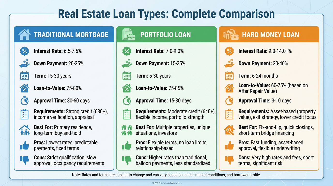 Traditional vs Portfolio vs Hard Money Loans: Complete Guide for Real Estate Investors (2026)